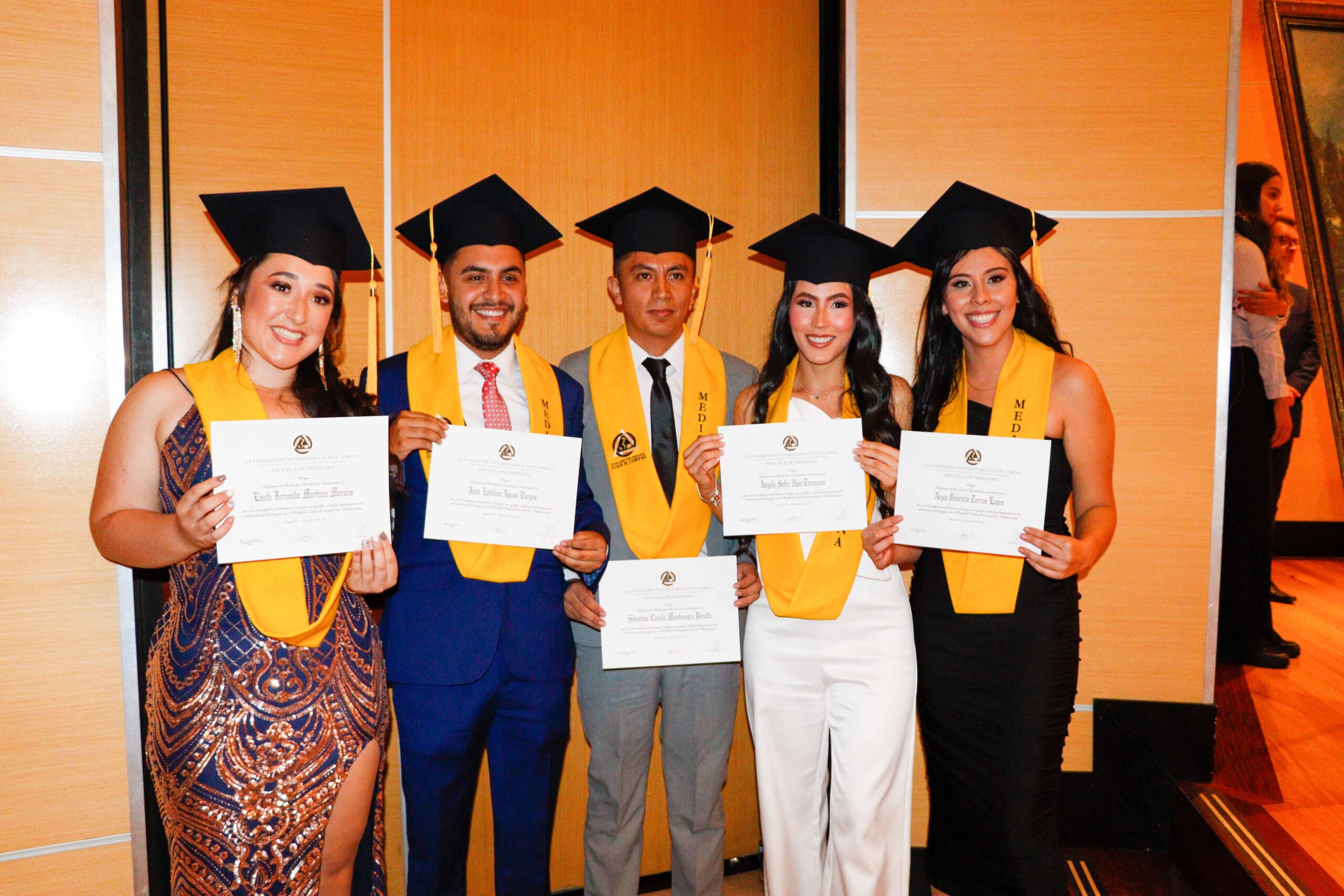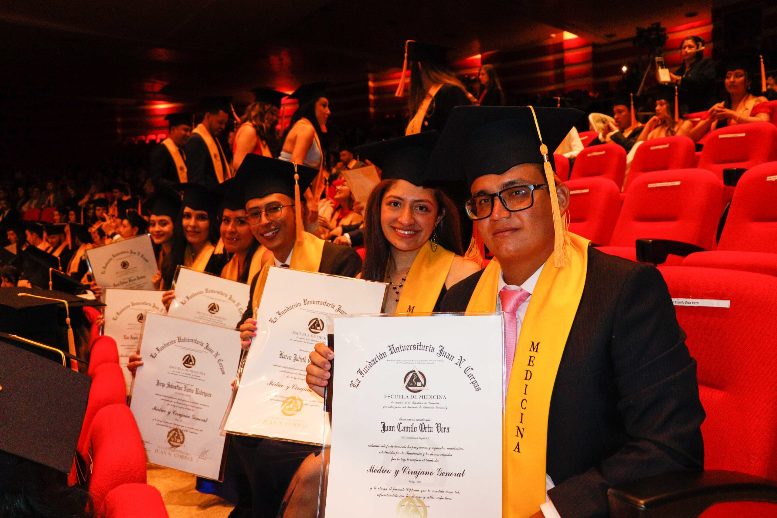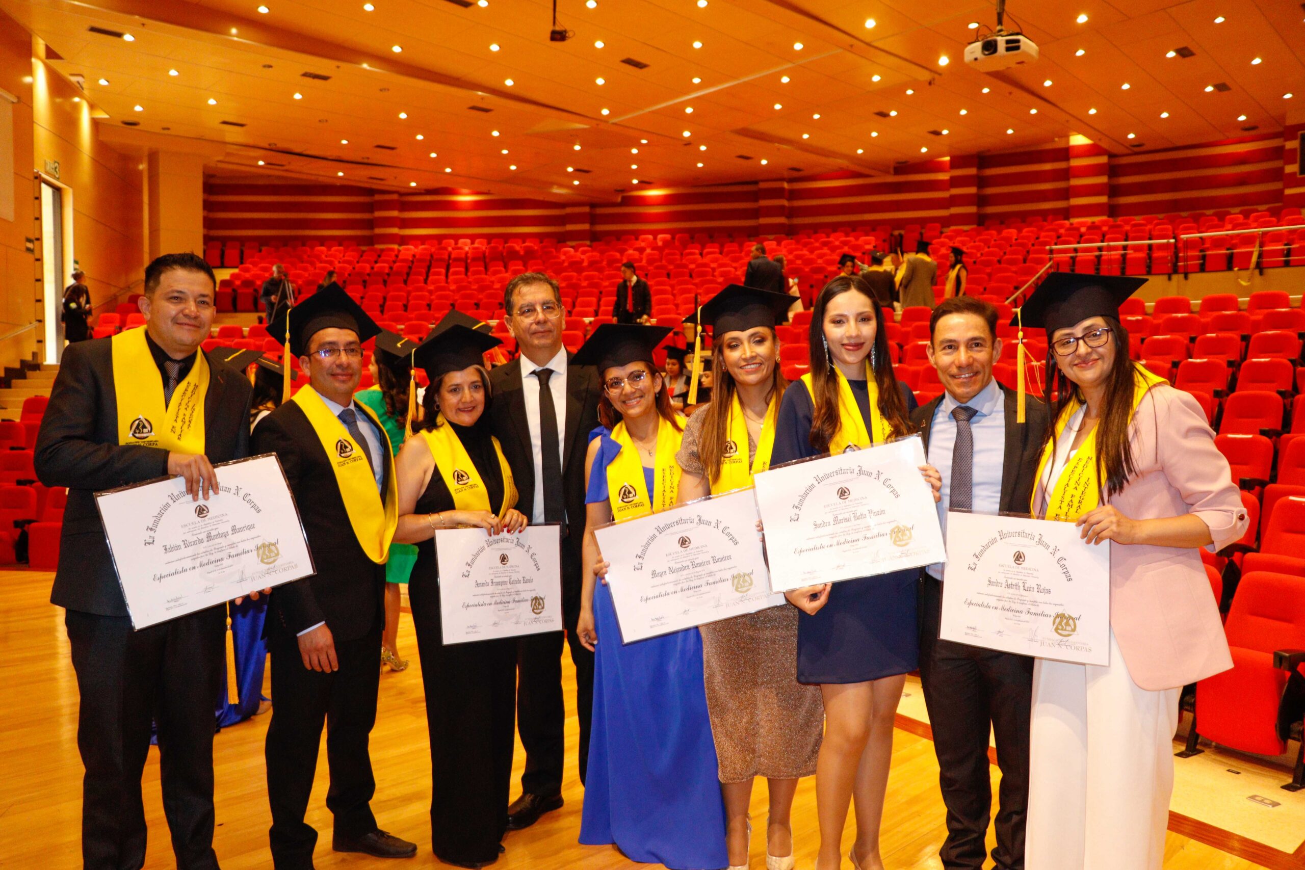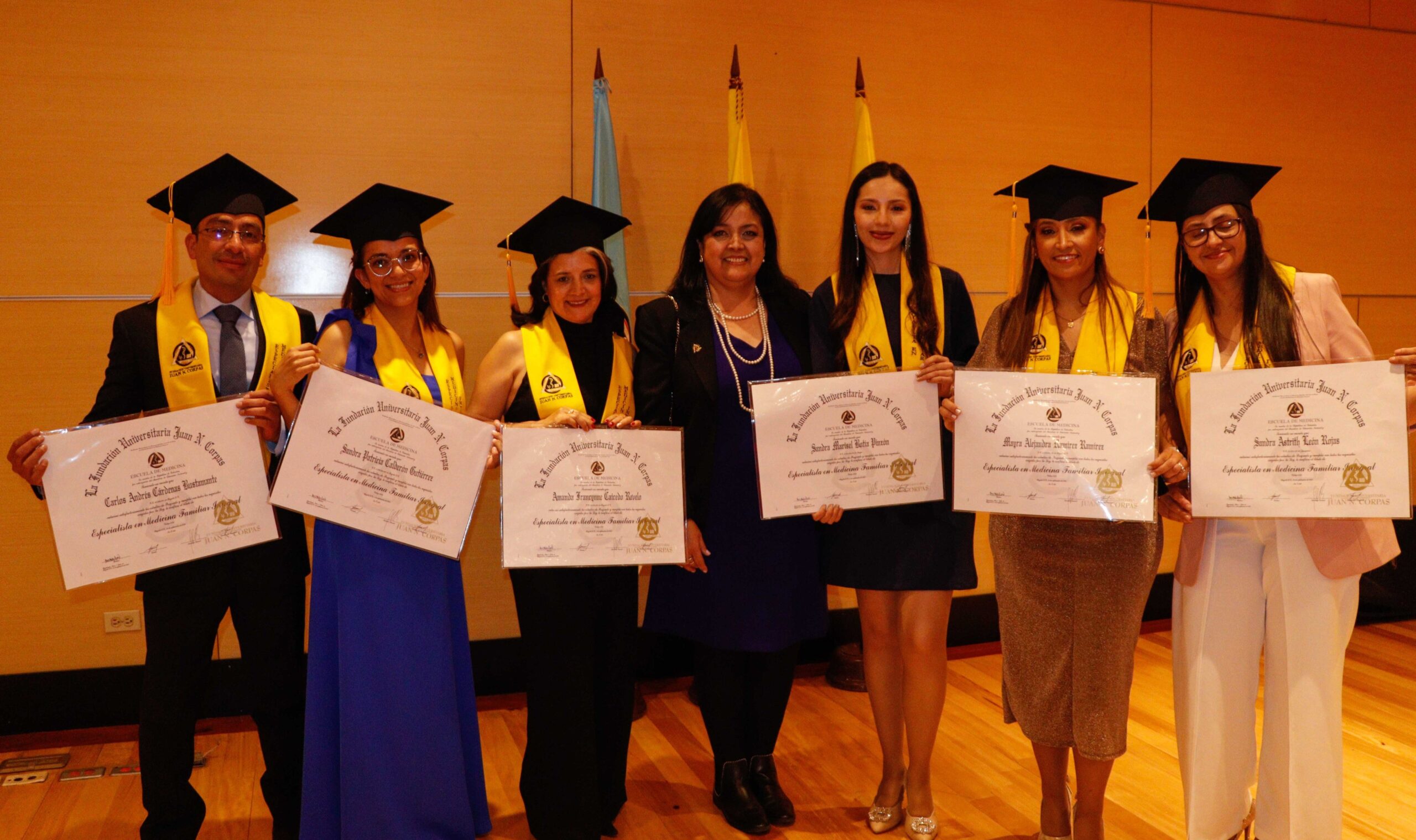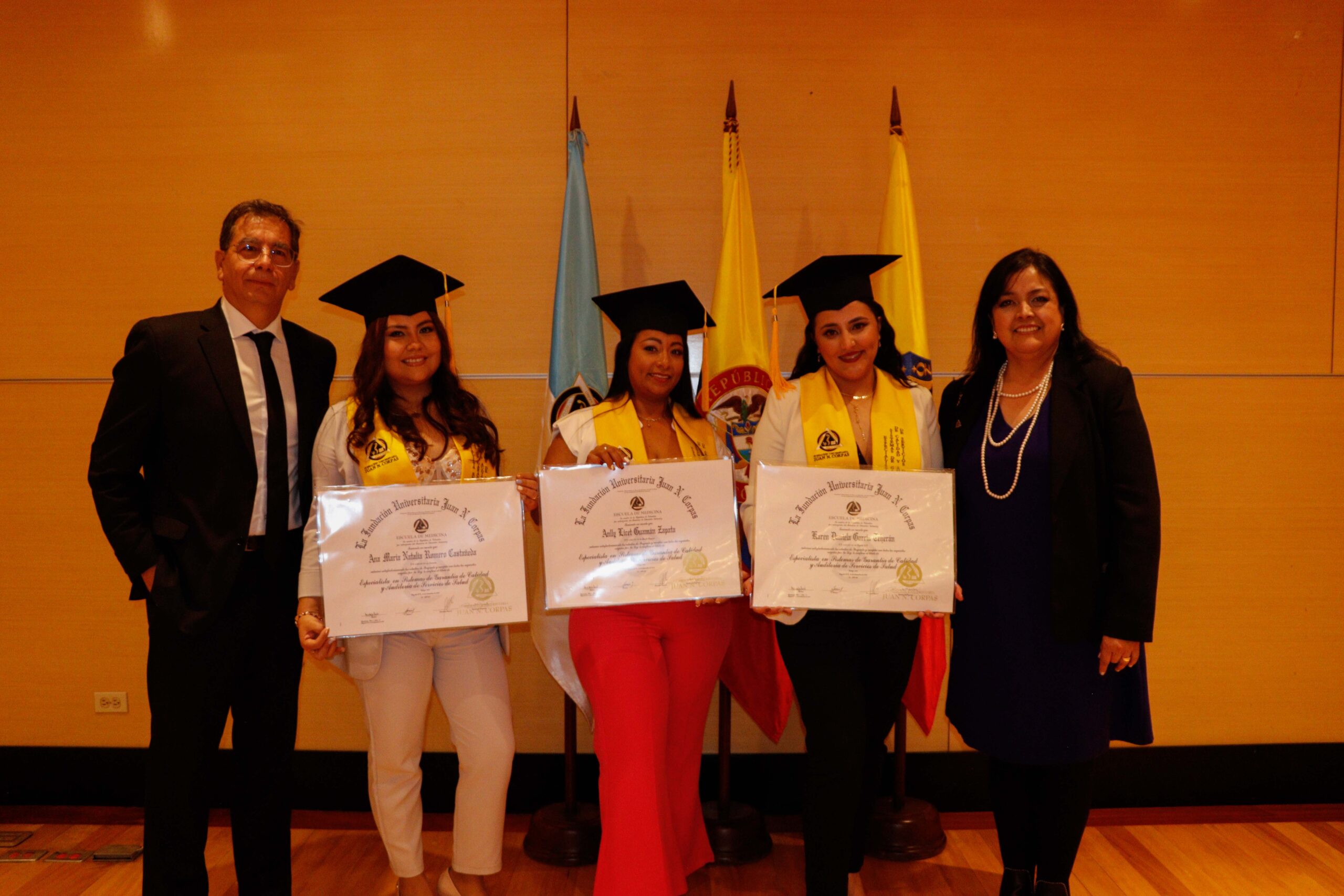Para la ceremonia de grado de las 9:00 a.m., participaron la Dra. Ana María Piñeros Ricardo, Rectora de la Fundación Universitaria Juan N. Corpas, el Dr. Otto Hamann Echeverri, Decano de la Escuela de Medicina, la Dra. Mónica Álvarez, Jefe de Gestión Académica de dicha Escuela, el Dr. Juan Carlos Velásquez, Director del Departamento de Bienestar Universitario, la Dra. Luz Helena Carvajal Pabón, Coordinadora de Semiología, el Dr. Luis Alfredo Ramírez Cano, Director de Rotaciones Extramurales y el Dr. Denny Luengas Suárez, Director de Rotaciones Institucionales.