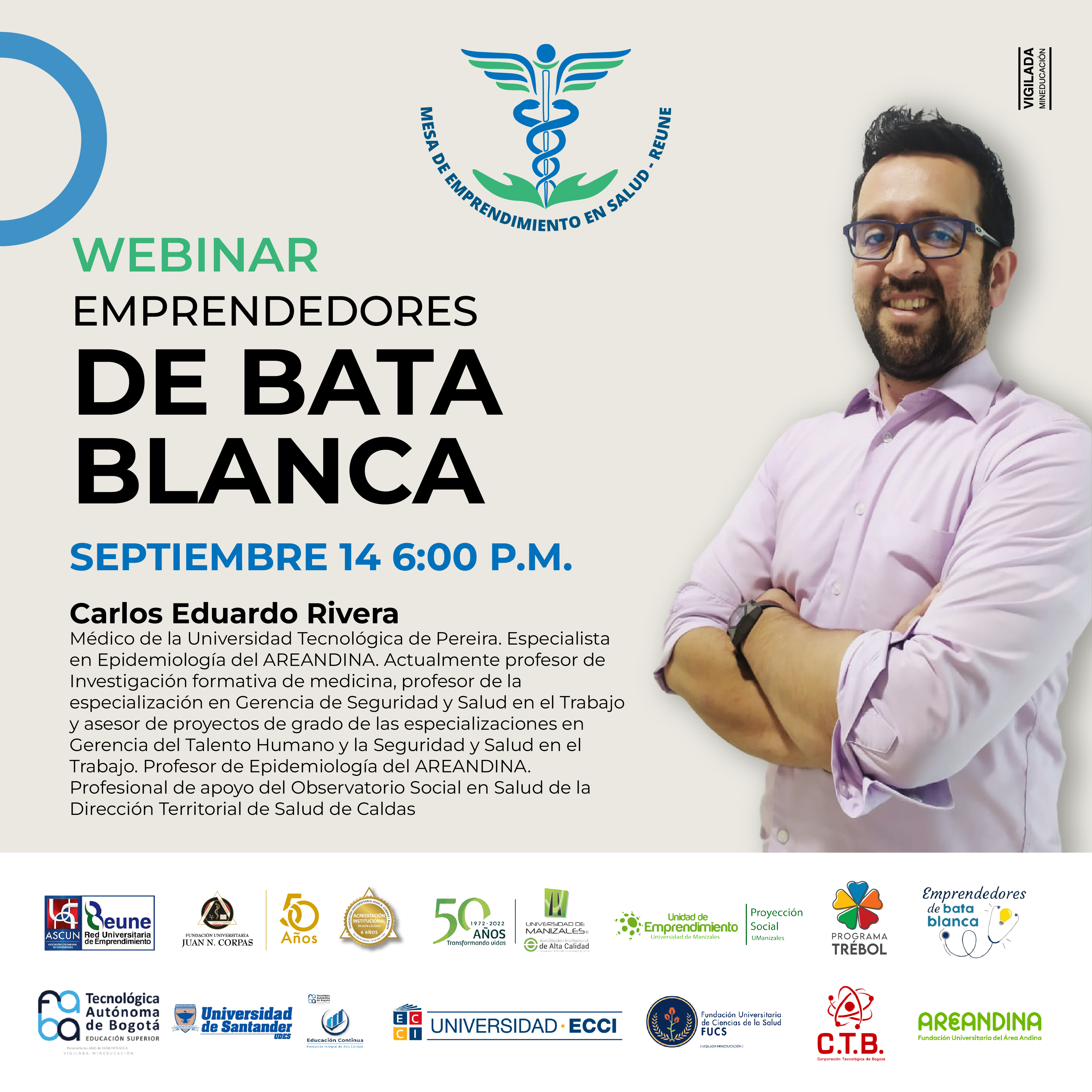 El Webinar “Emprendimiento de Bata Blanca” es organizado por la Mesa de Salud de la Red Universitaria de Emprendimiento (REUNE) de la Asociación Colombiana de Universidades (ASCUN), conformado por la Fundación Universitaria Juan N. Corpas, la Fundación Tecnológica Autónoma de Bogotá (FABA), la Corporación Tecnológica de Bogotá, la Universidad ECCI, la Fundación Universitaria de Ciencias de la Salud (FUCS) y la Universidad de Santander (UDES).