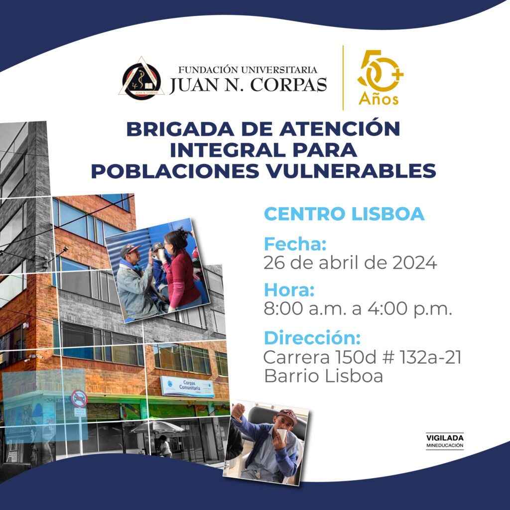 El Centro Comunitario Corpas Lisboa y el Departamento de Medicina Comunitaria de la Fundación Univeristaria Juan N. Corpas desea informar a su comunidad educativa que el próximo viernes 26 de abril se realizará la Brigada de Atención Integral para Poblaciones Vulnerables.