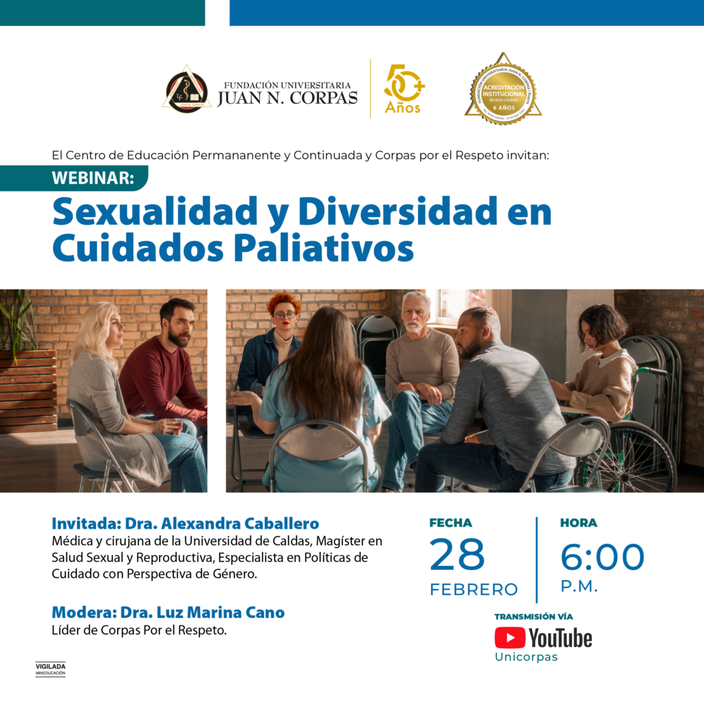 El Centro de Educación Permanente y Continuada (CEPC) de la Fundación Universitaria Juan N. Corpas y el programa CORPAS POR EL RESPETO invitan a toda la comunidad educativa y al público general a conectarse el próximo viernes 28 de febrero al webinar ‘Sexualidad y diversidad en cuidados paliativos‘.