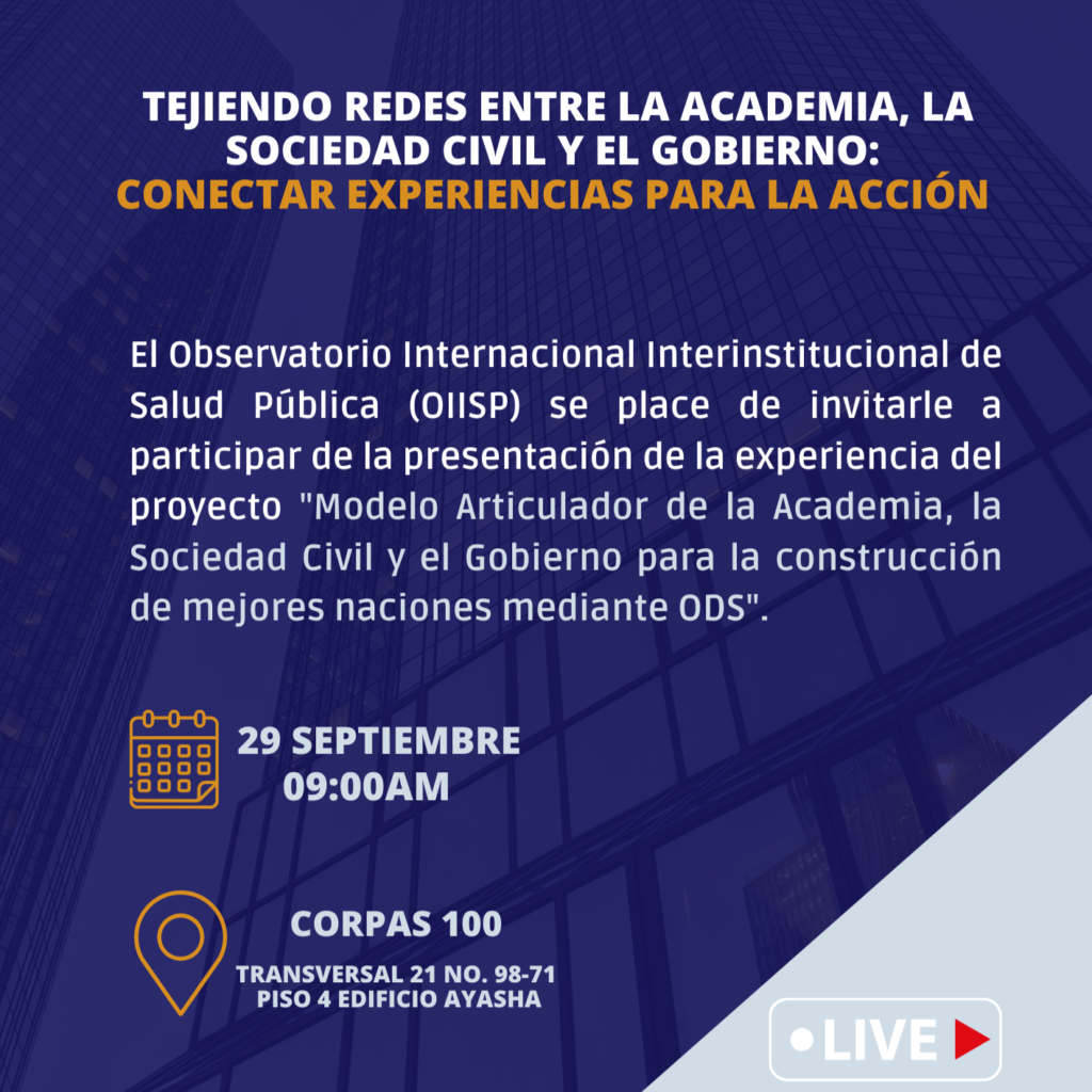 El Departamento de Iniciativas Globales de la Fundación Universitaria Juan N. Corpas y el Observatorio Internacional Interinstitucional de Salud Pública (OIISP), desean invitarte a conectarte mañana viernes 29 de septiembre a las 9:00 a.m., a la presentación de la experiencia del proyecto: “Modelo Articulador de la Academia, la Sociedad Civil y el Gobierno para la construcción de mejores naciones mediante ODS“.