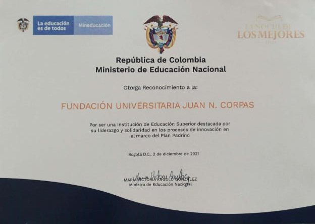 Por otro lado, cada año el Ministerio de Educación Nacional celebra la excelencia académica de las universidades y centros de aprendizaje de Colombia en: La Noche de los Mejores. En su edición 2021, la Fundación Universitaria Juan N. Corpas recibió un reconocimiento especial por: “Ser una Institución de Educación Superior destacada por su liderazgo y solidaridad en los procesos de innovación en el marco del Plan Padrino”.